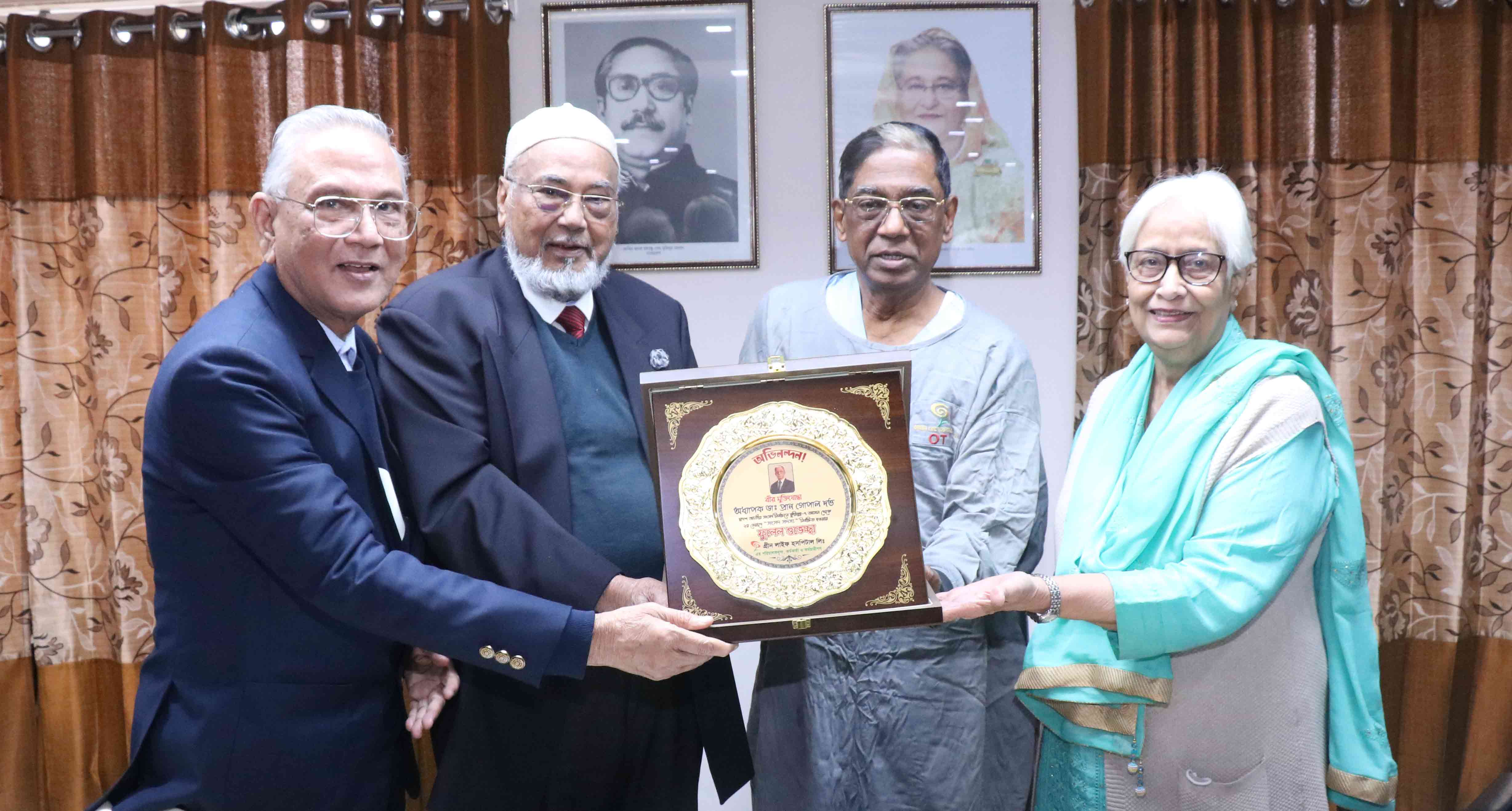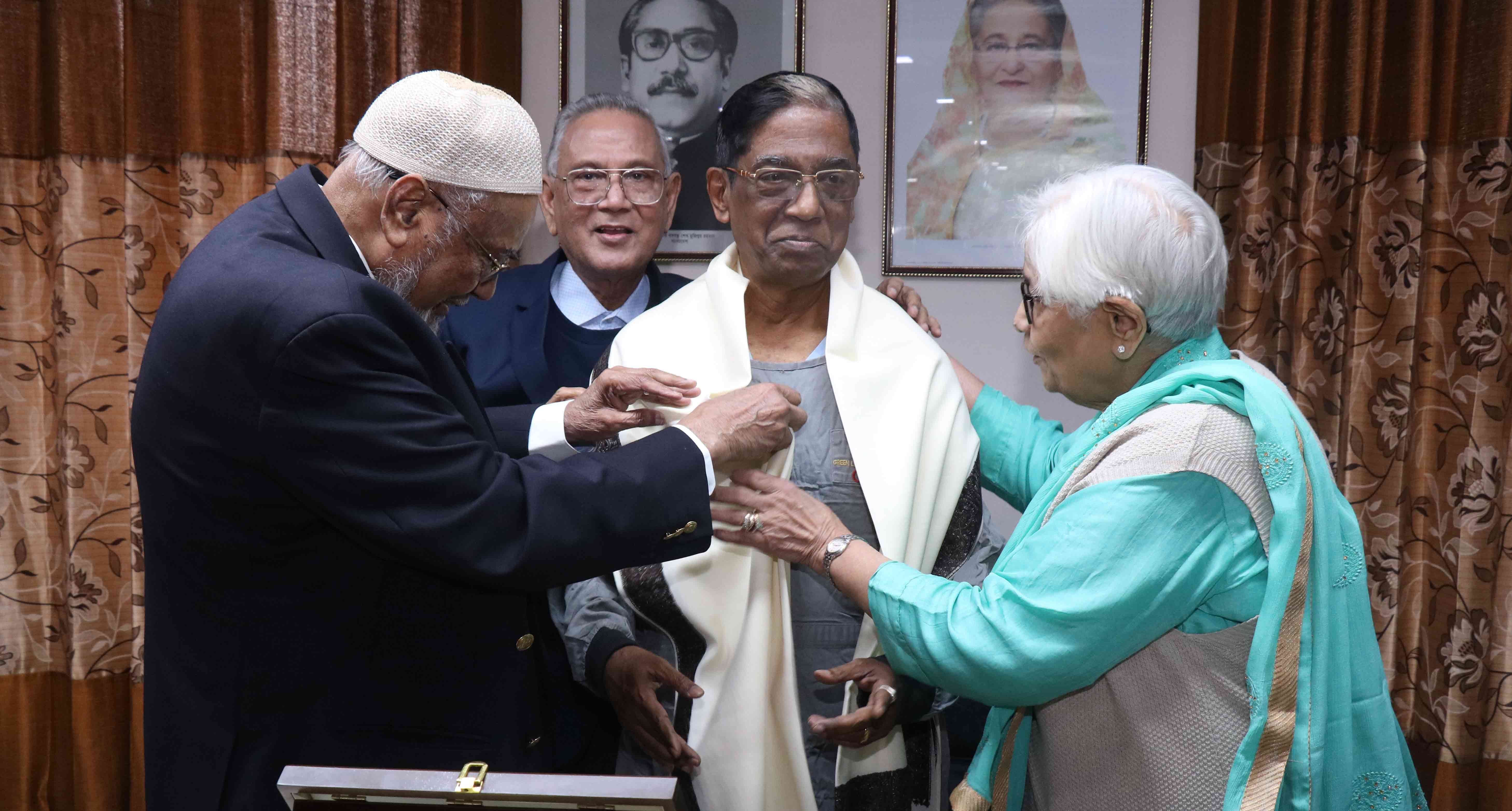 অধ্যাপক ডাঃ প্রান গোপাল দত্তকে, ফুল ও সম্মাননা ক্রেস্ট দিয়ে শুভেচ্ছা ও অভিনন্দন